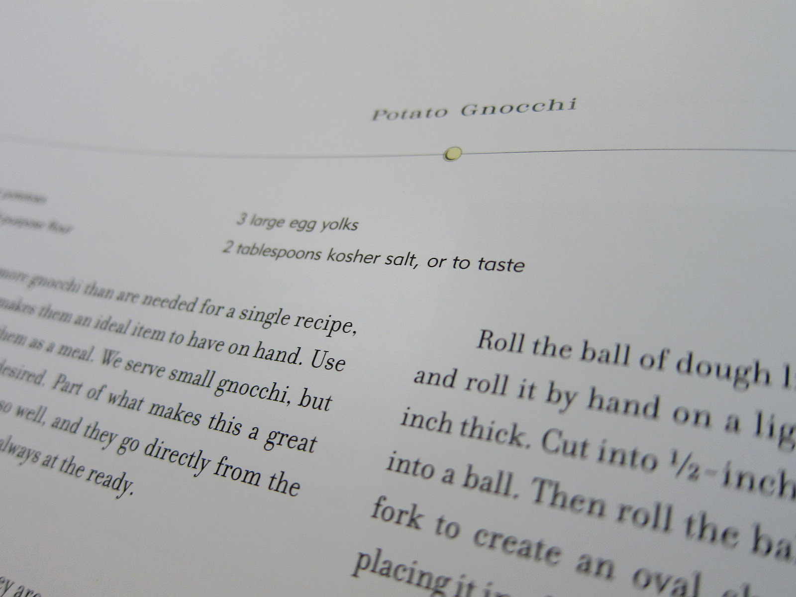 When I went to shape the gnocchi I found that the technique instructed in the book did not work well for me so I did my own thing of: rolling the dough snake then cutting the pieces off then rolling the pieces into balls then forming the ridges with a fork.