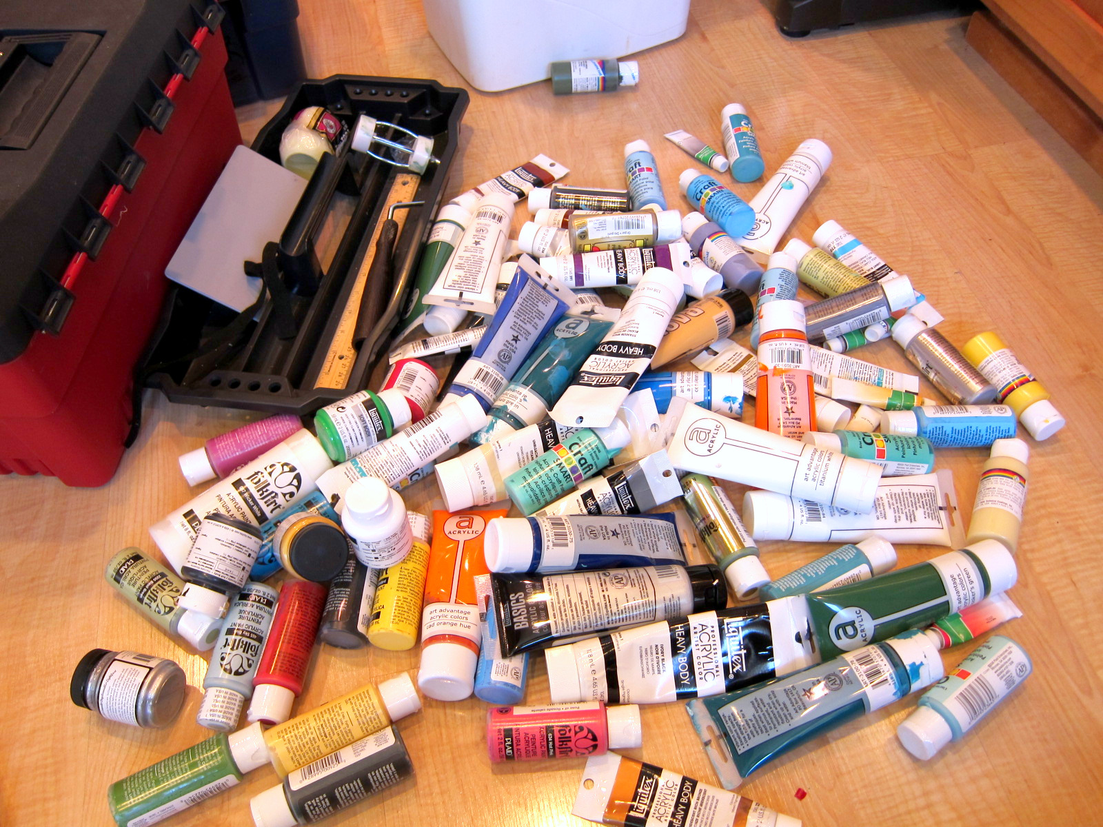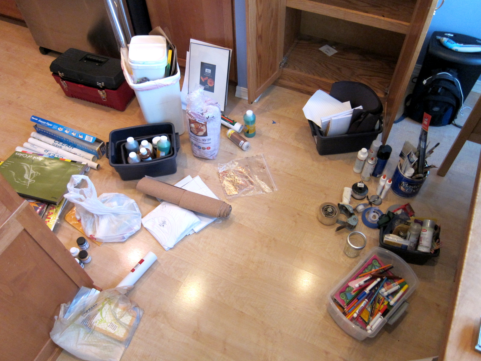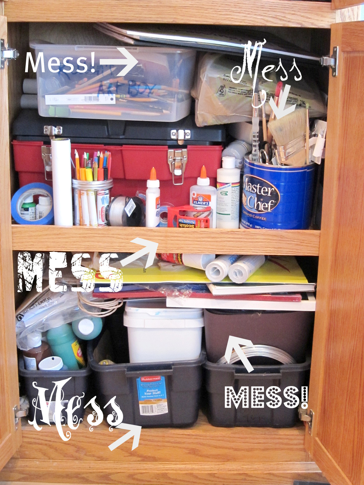 Let me see, moldy play-dough, dried up paint tubes, really dirty paint brushes, leftovers from about ten different projects. I’m sad to say this, my friends, is my cupboard. So it’s all me.