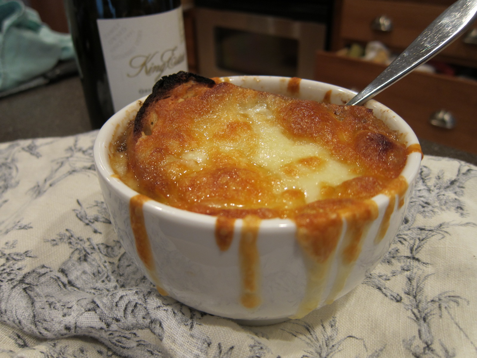 Spoon the soup into 8 individual ovenproof crocks and top each one with a crouton and a layer of grated cheese.