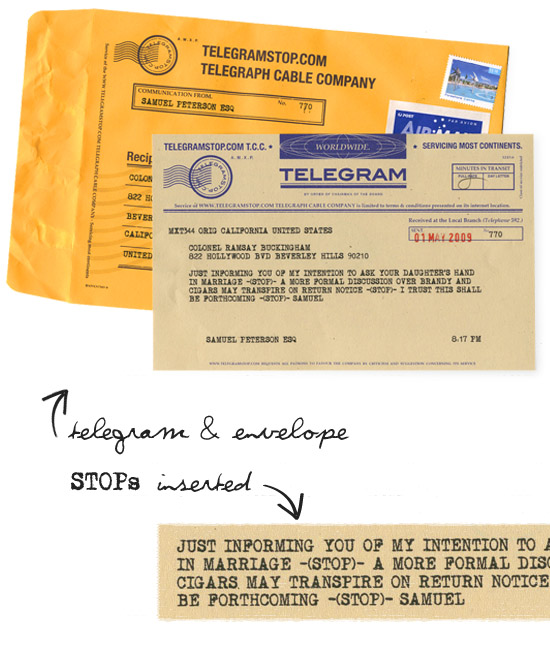 Send someone a real life telegram STOP It would be a cool invitation idea STOP Also a great thank you note STOP Find out why people used to end sentences in telegrams with the word stop STOP Okay I’ll stop it now STOP