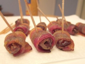 Stuff the cheese into the dates then wrap half a slice of bacon around the dates.