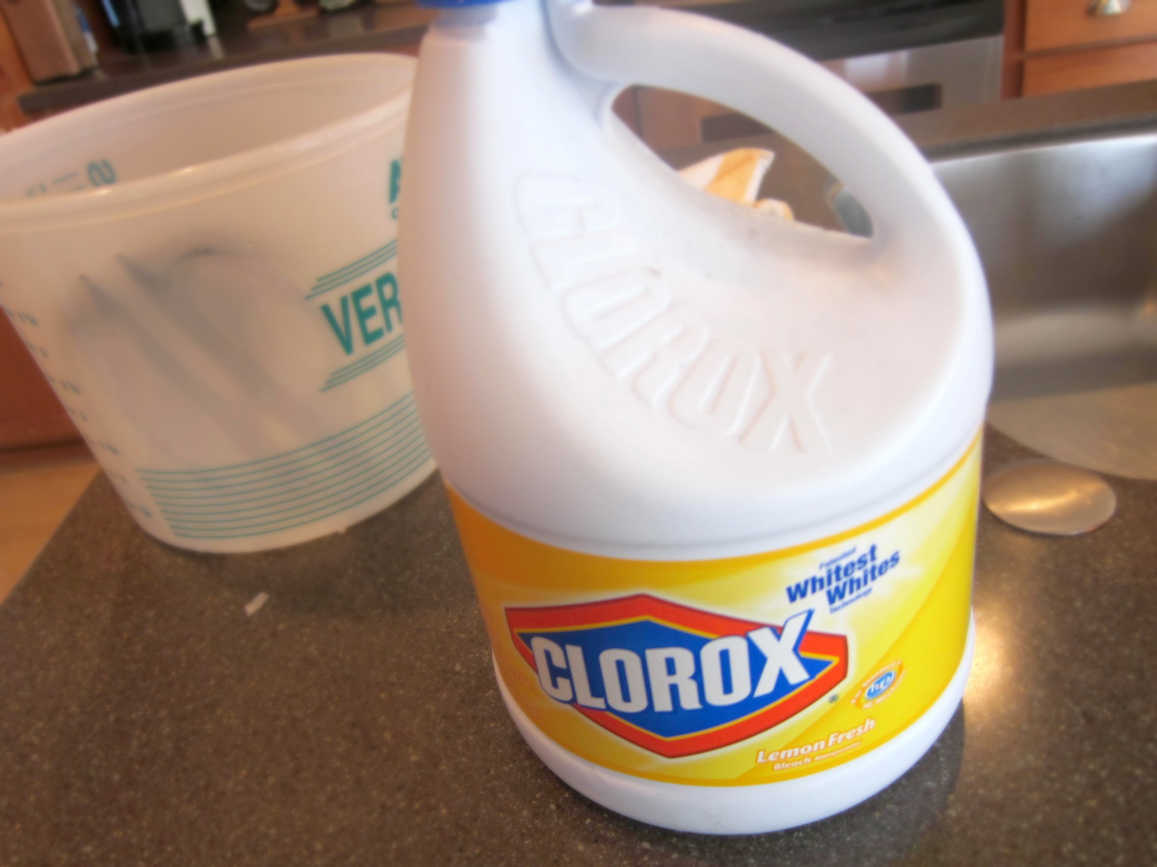 I forgot to take a picture of the bleaching process, but anyone who’s ever had to fix a white shirt or (I’m showing my age here) acid wash a pair of jeans, knows what to do. Simply fill the sink with half cold water, half bleach and let your fabric sit in the bath for about 30 minutes.