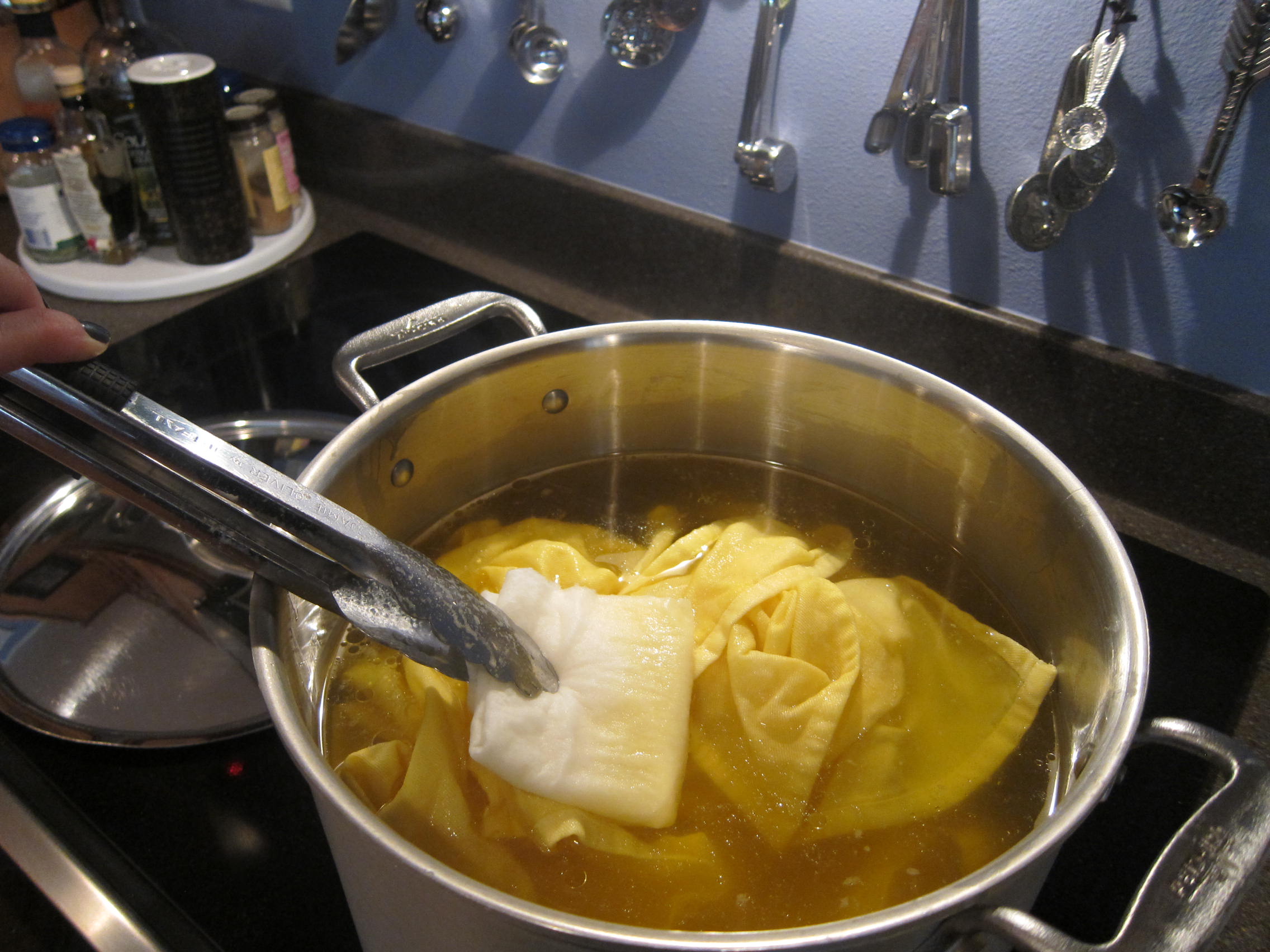 I went ahead and tried to get out as much of the wax via the ironing method. Then I popped the napkins into my biggest pot with hot water and boiled them for about 15 minutes. I skimmed of the wax that floated to the top with paper toweling and tongs.