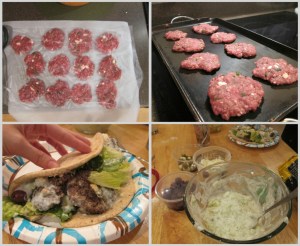 To assemble the sandwiches fold the meat into a flat bread and top with Shredded Lettuce, Tomato, Feta Cheese, Calamata Olives and Tzatziki Sauce.