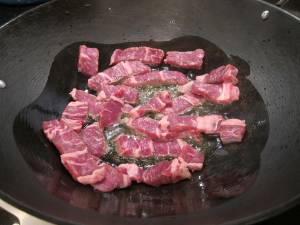 In a large skillet or Wok heat the garlic oil over medium high heat. Brown the sliced beef in batches for about 2 minutes a side. Set meat aside.