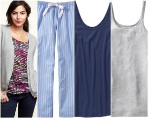 Outfit #8 (Are PJs’ an outfit?) PJ bottoms, tank top, hotel robe or grey cardigan.