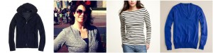 Outfit #6 Blue skinny jeans, grey cardigan, striped boat-neck tee, gold flats, skinny belt over the sweater.