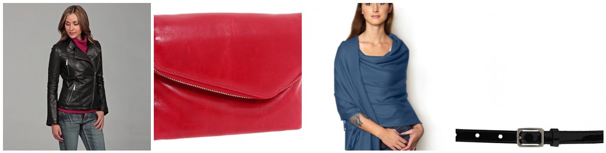 Outfit #5: Cream skinny jeans, cream blouse, red heels, leather jacket, blue pashmina.