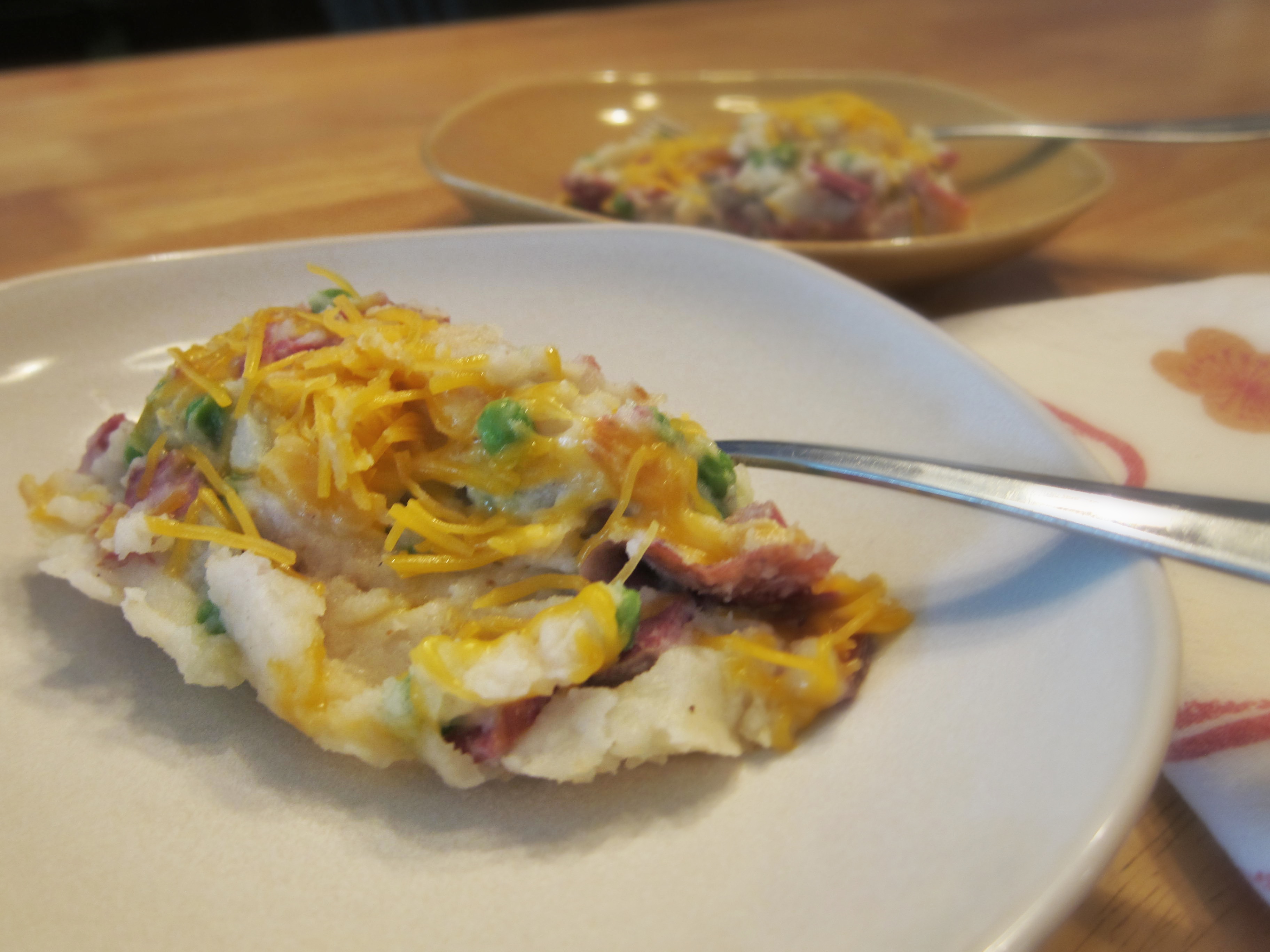 Add the shredded corned beef and thawed peas as the next layer.
