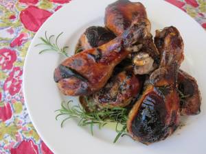 Divide the chicken legs between two gallon size plastic bags. Prepare the marinade, and divide in half then pour over the chicken. Place in the fridge for at least two hours, or better, six hours.