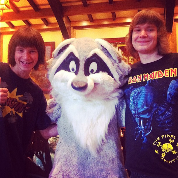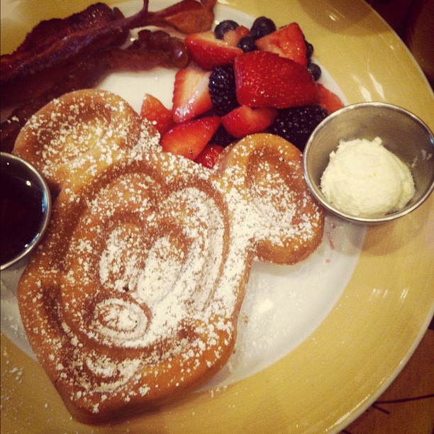 As we were staying in the hotel, we started our days at The Storytellers Cafe. Like all the restaurants in the resort hotels it’s a “character breakfast”. I was curious as to whether or not the boys would be into interacting with the characters this time around. It was really fun when they goofed around and posed for pictures between bites of Mickey shaped waffles, just like the younger kids.