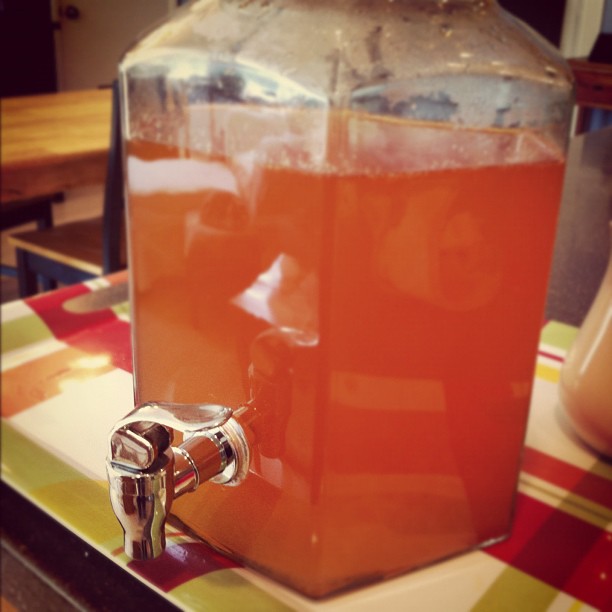 Strain and combine with the brewed tea. Refrigerate until ready to serve over ice.