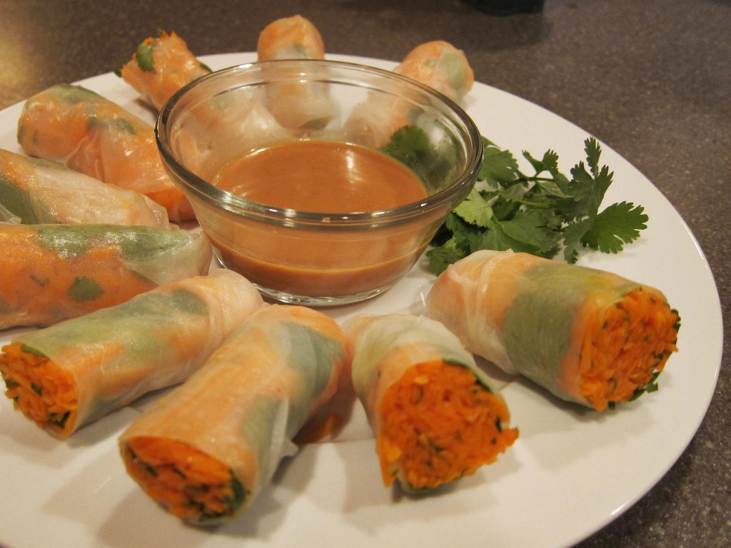 Browsing through some collected recipes last week, I ran across a favorite for a carrot and cilantro salad that I’ve served with my version of Chicken Tikka Masala. It occurred to me that the salad would make excellent spring roll filling. I hadn’t yet attempted spring rolls so I turned, as I usually do, to the internet for tutorial. Happily, I immediately happened upon this video of Rachel of Elephantine making spring rolls.