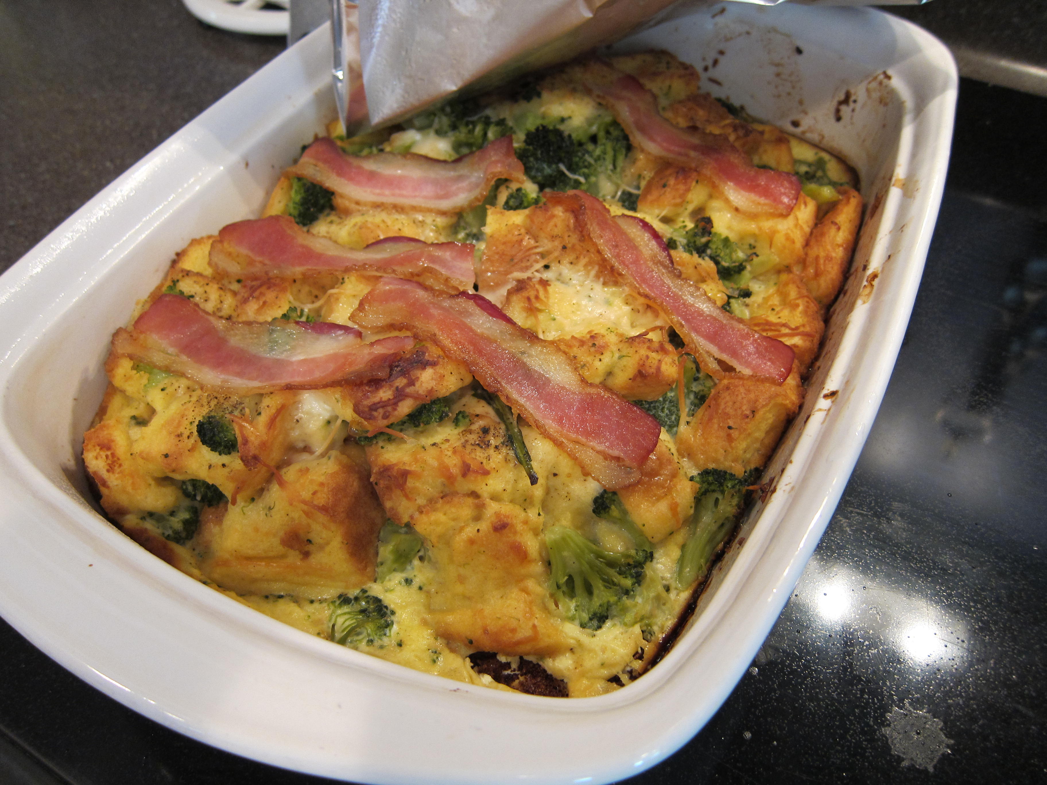 Cut the bread into roughly 2 inch chunks leaving the crust on and place in a very large mixing bowl. Add the thawed broccoli.