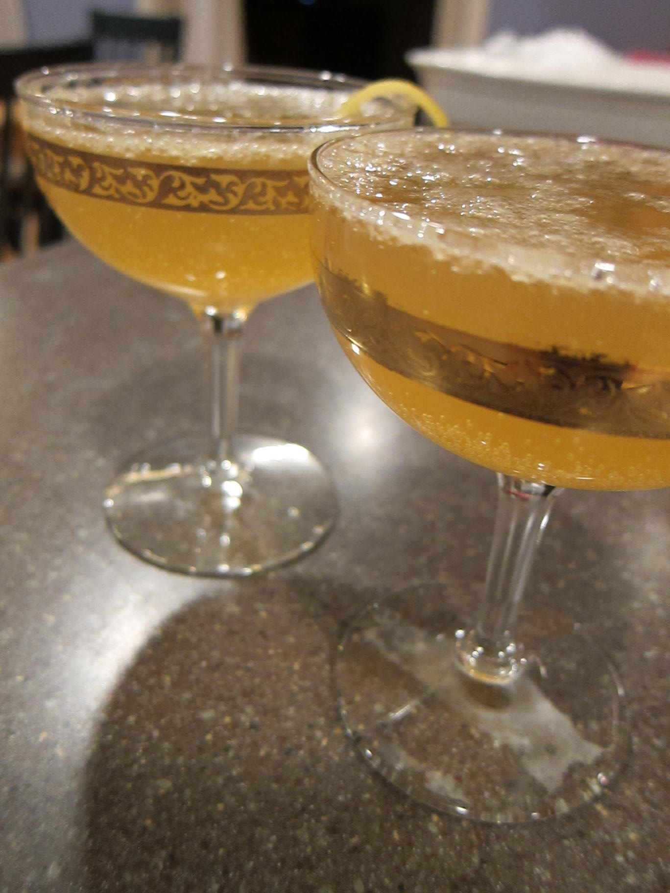 Divide the lemon mixture between two champagne coupes, top the rest of the glass with champagne.