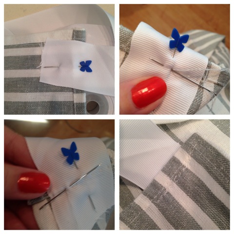 3. Pin each ribbon at the top of the towel to form the apron strings (ties)