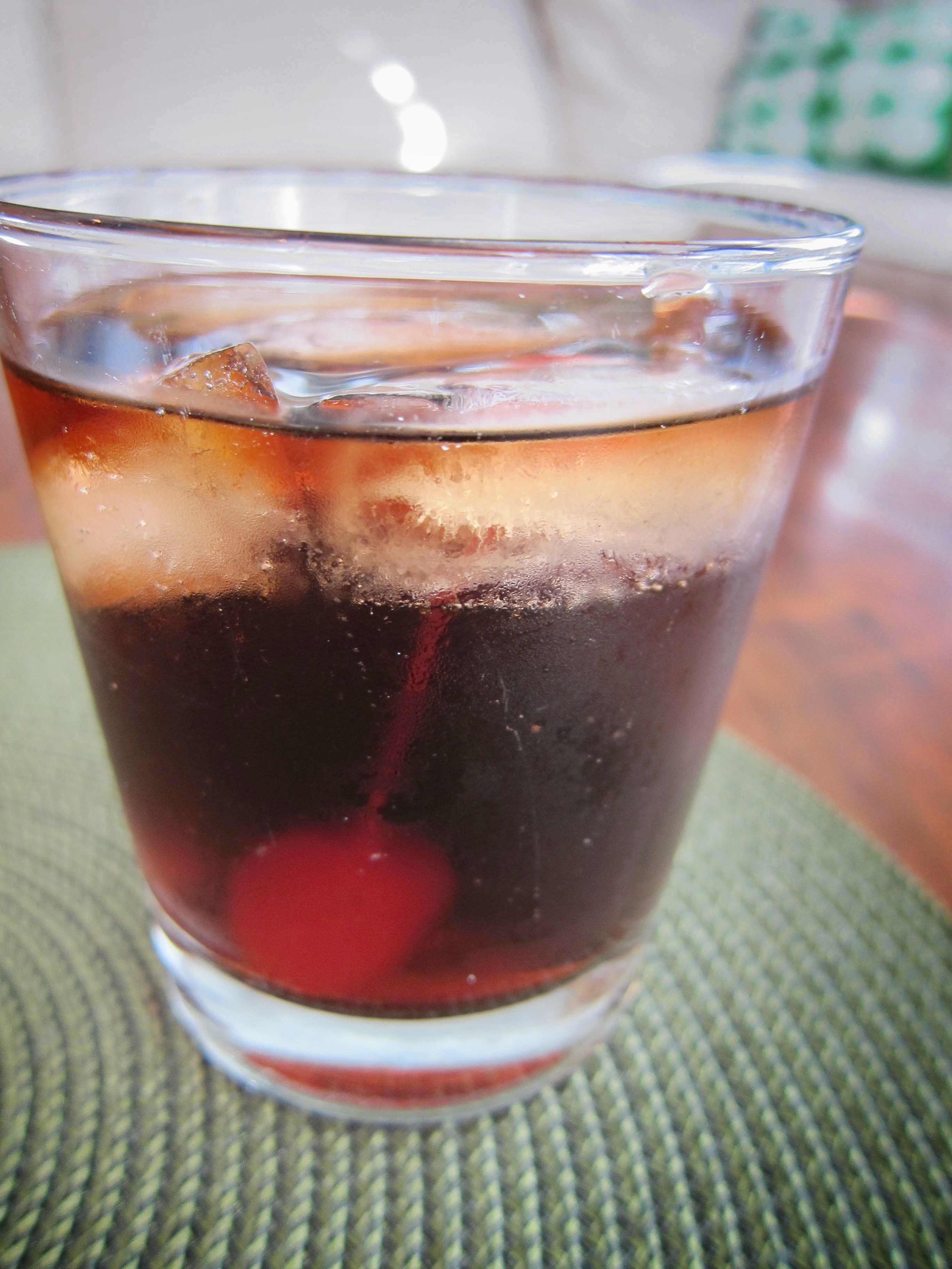 Fill a glass with ice and add the rum and cherry syrup. Top the glass with cola. Garnish with cherries.