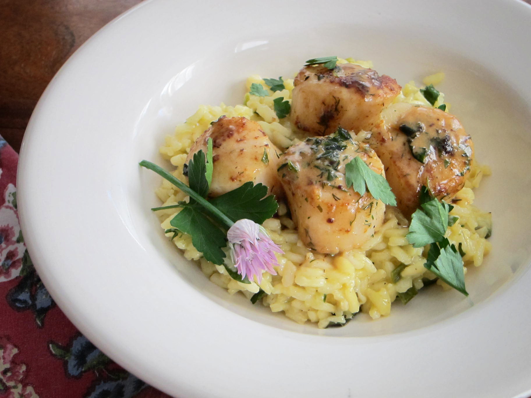 Serve with the Risotto, the cream sauce poured over. Garnish with chives.